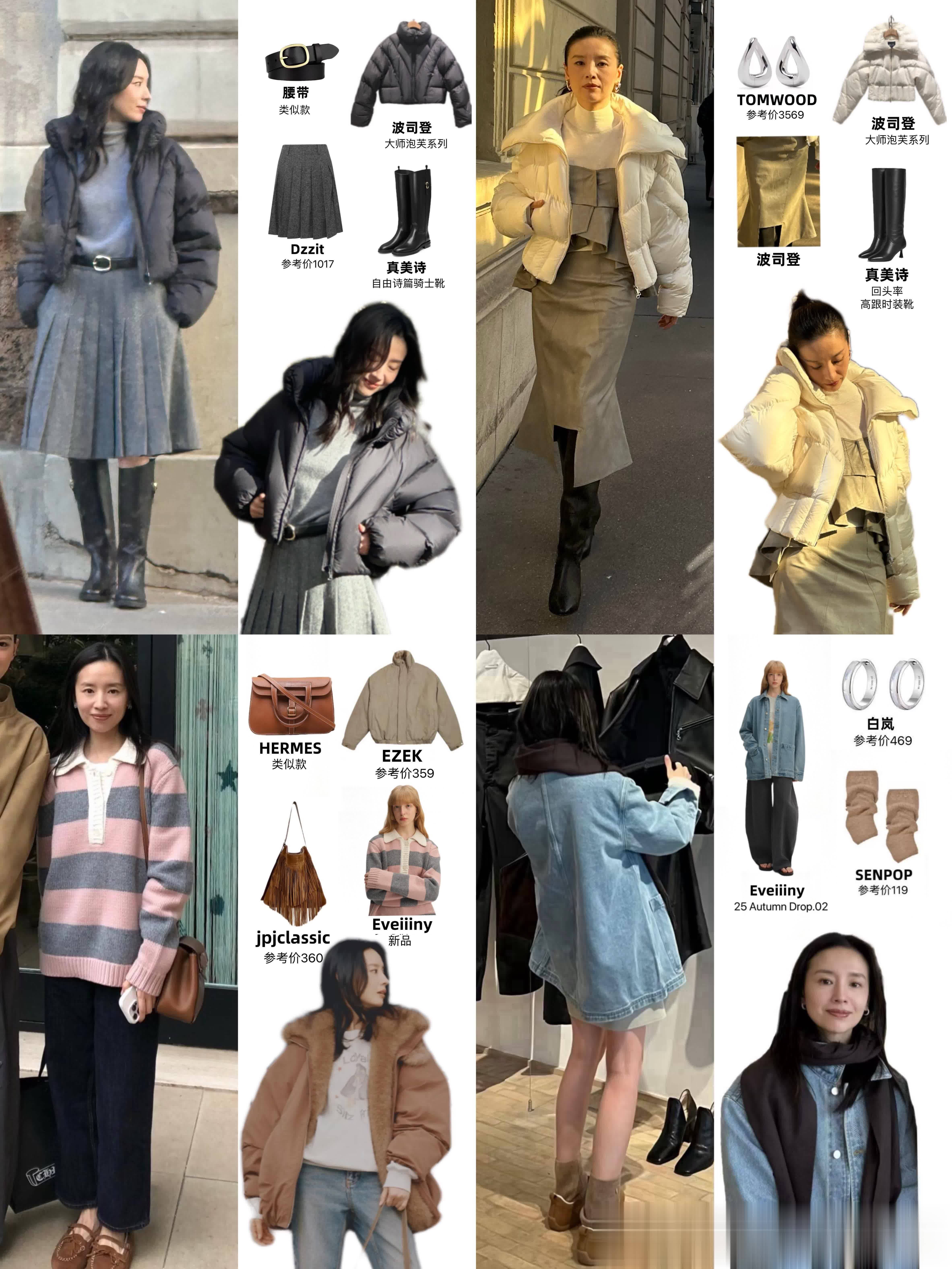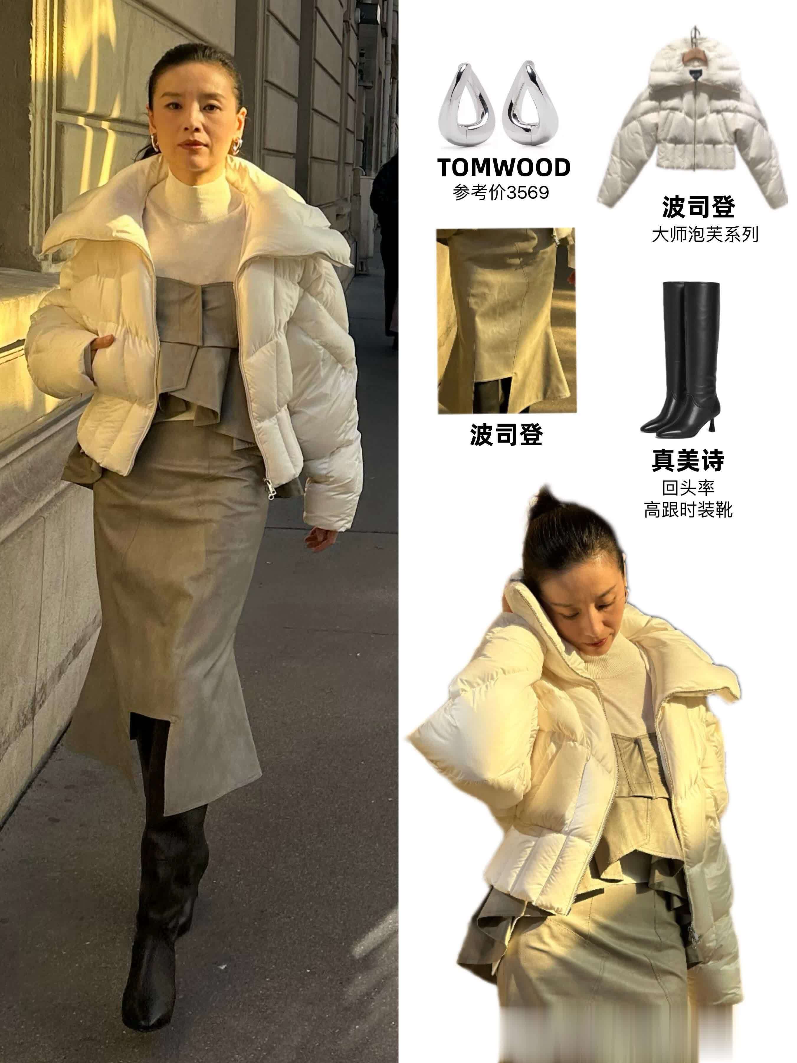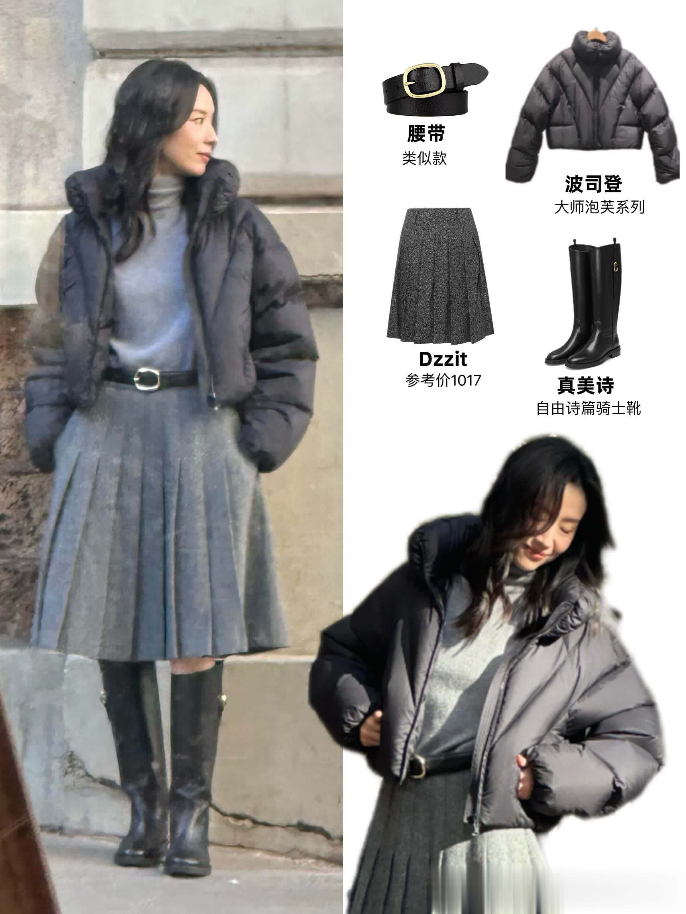先看左上角那套“羽绒服+百褶裙+长靴”,把“保暖与优雅”焊死了!深灰色短款羽绒服选的是廓形款,看着鼓鼓囊囊却不显胖,腰间系条棕色皮带,瞬间把比例拉得超好。里面搭件浅蓝高领内搭,露出一点点领口更精致,底下配条灰色百褶裙,长度到膝盖,走路时轻轻晃,配双黑色长靴,靴筒刚好到大腿,保暖又显腿长。站在老洋房门口,阳光照在羽绒服上,暖乎乎的却透着股文艺劲儿,去上班或者约会,被夸“像画报里的姐姐”,黄皮穿这浅蓝内搭也显白,亲测有效~